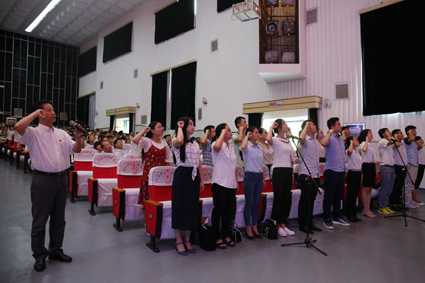 XX职院新闻网讯(党委宣传部)“我宣誓:忠于人民的教育事业,履行教师的神圣职责。爱国守法、敬业爱生……为中华民族的伟大复兴,为人类社会的文明进步,我愿献出全部力量!”9月8日,在第33个教师节来临之际,我校组织开展新任教师师德规范宣誓活动,23名新任青年教师代表庄严宣誓,铮铮誓言表达了九职教师对教育事业的忠贞不渝,对教书育人的执着追求。